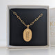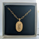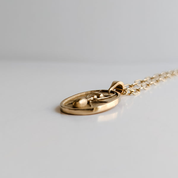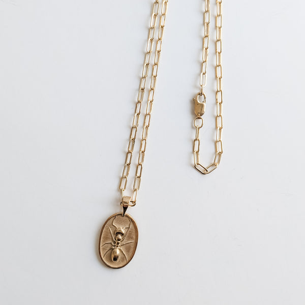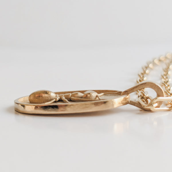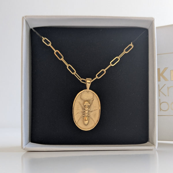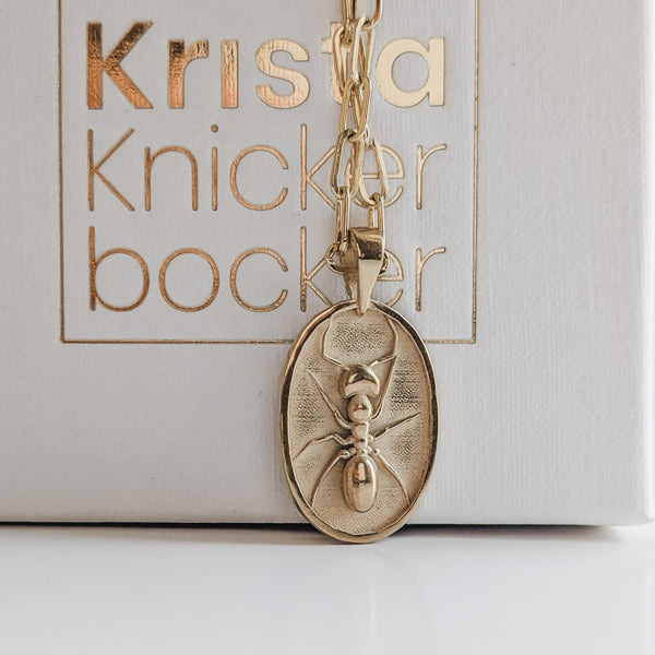 The Ant Crest Pendant features an oval pendant suspended from a sturdy, large link chain. The pendant’s raised edge creates a recessed central area, where a finely detailed carpenter ant stands proudly. Available in sterling silver or 14k gold vermeil, this piece carries deep symbolism rooted in the strength of collective effort.