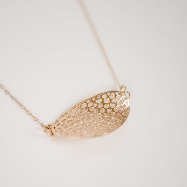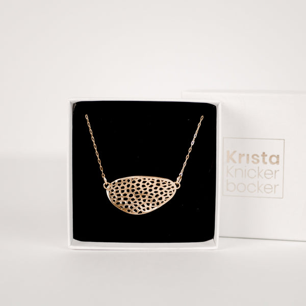 Inspired by light and frothy sea foam, this necklace is open and airy, while still having a substantial sparkle and presence.  The pendants curved geometry makes it beautifully reflective.  This piece is designed and fabricated with a unique combination of 3d printing technology, hand carving, and hand finishing.  The pendant sits above most collar lines and looks great with a button up shirt.