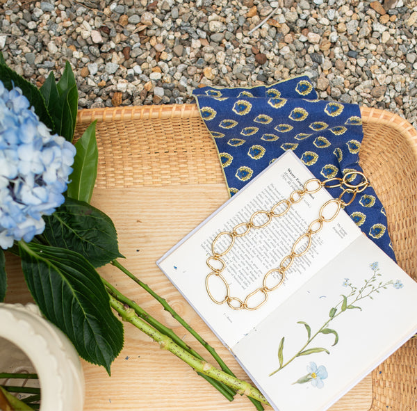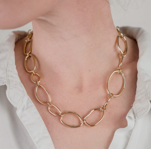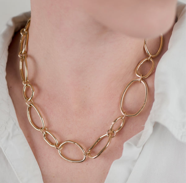 Handcrafted with love and care, this 18-inch chain exudes an air of ancient elegance. Each link is hand formed and cast, delightfully varying in size to create a whimsical and one-of-a-kind aesthetic.