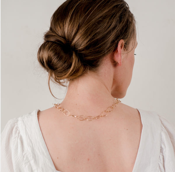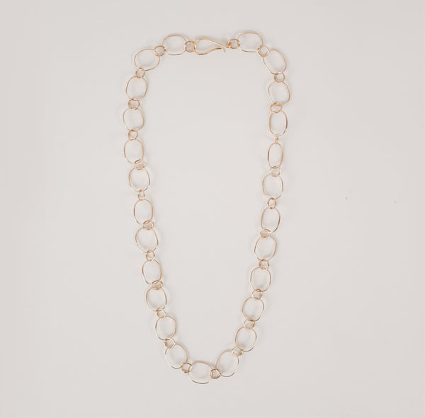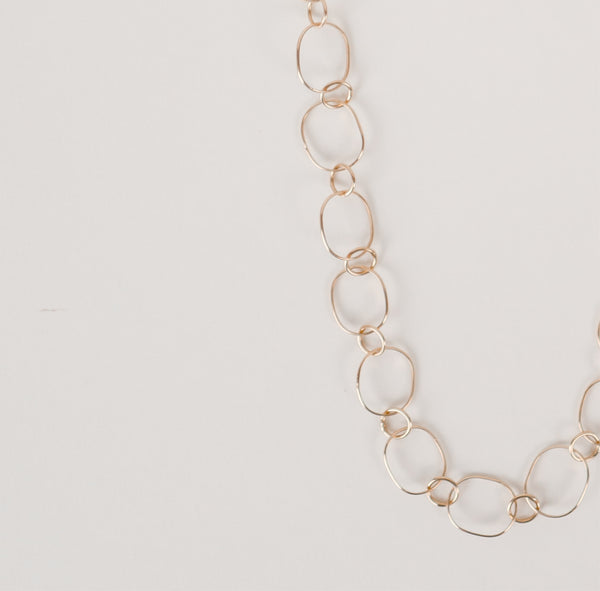 This light and airy chain is so comfortable to wear that you will definitely forget you have it on. Handcrafted from wire, the play of link sizes and wire geometries adds such a lovely sparkle to your everyday wardrobe. The lightly hammered hook clasp makes it easy to take on and off, and blends in beautifully with the links allowing the necklace to rotate without looking like it's hanging "wrong".