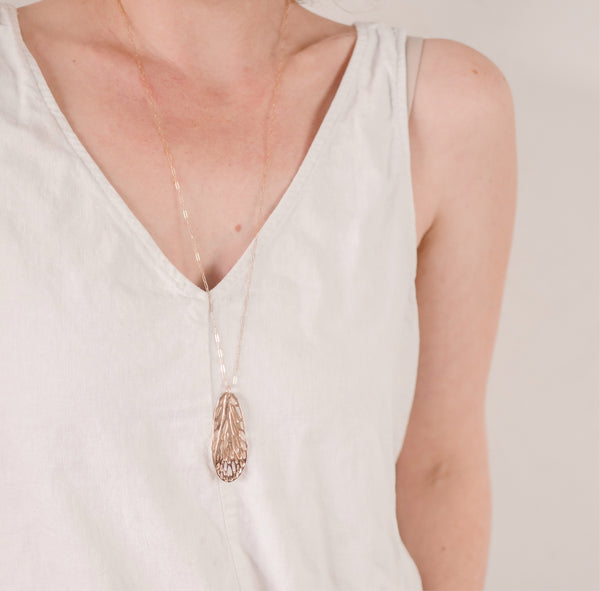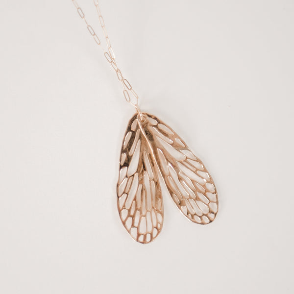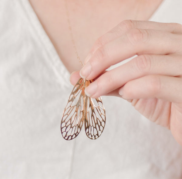 The delicate but strong wings of this necklace remind us that we can't always see where out path is leading us, and whether we are in the mud or climbing towards the waters' surface, we are all born to take flight. The two wings move freely to create a light and satisfying clinking sound, as a fluttering reminder in the background of your day.