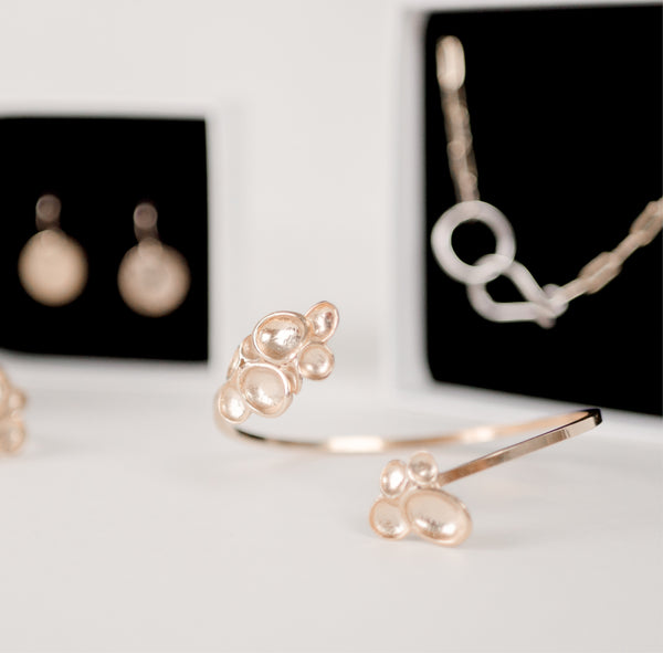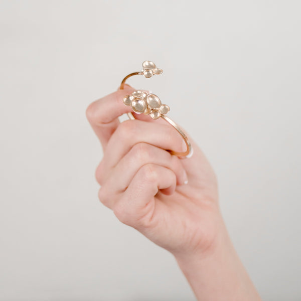 Introducing the Tidepool Cuff, a handcrafted bracelet inspired by the intricate beauty of coastal tidepools. Organic clusters adorn each open end, mimicking the natural formations found along the shoreline. Available in sterling silver or 14k vermeil, this cuff captures the dynamic interplay of nature, evoking the quiet strength and fluidity of the sea. Designed to embrace your wrist with an effortless elegance, the Tidepool Cuff is a piece that connects the wearer to the serene power of the sea.