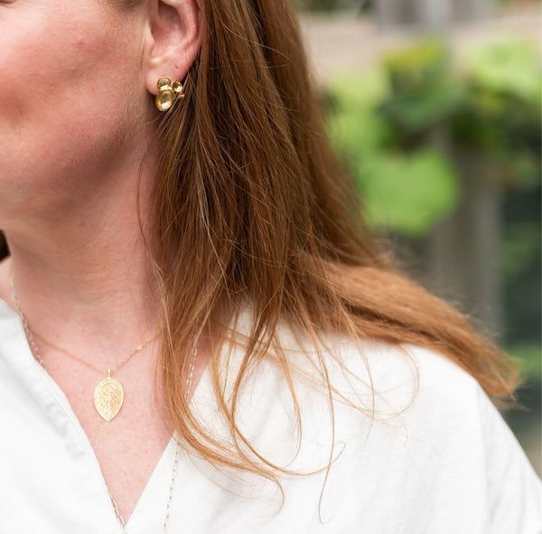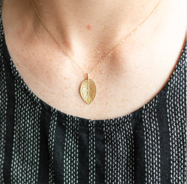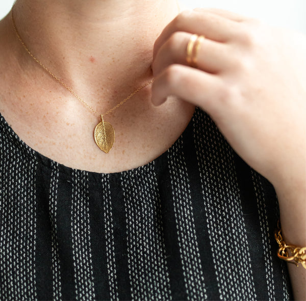 Carry your creativity with you every day with this beautiful, delicate beech leaf necklace. As a symbol of increased creative energy, this substantial sterling silver or 14k Gold Vermeil leaf is beautifully textured with the organic veining and cells of nature. The little sister to our Large Beech Leaf Necklace, these piece is beautifully delicate and so light and comfortable to wear. Legend has it that no harm can befall a wandering traveler who seeks shelter under the branches of a beech tree, and that their leaves inspire creativity. May this necklace ignite your creativity every day, and serve as a constant reminder that you are never truly lost.